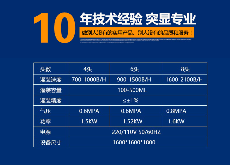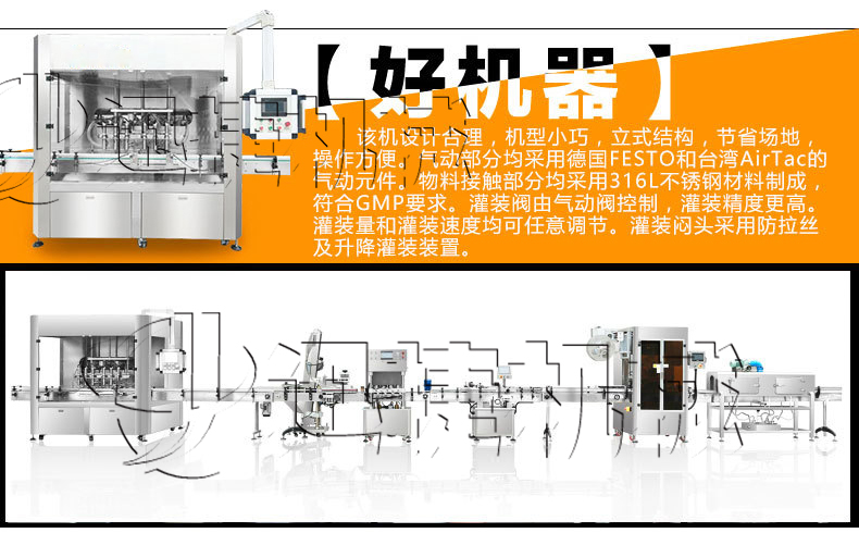 全自動辣椒醬六頭灌裝機作為公司新研發(fā)的灌裝設備在市場上起到了關鍵性的作用,是集光,機,電,氣于一體,采用活塞式定量原理,灌裝精度高,操作簡單,維護方便,設備主要材質(zhì):采用SUS304不銹鋼制造,符合衛(wèi)生要求.灌裝過程采用亞克力透明板與外界隔離,保證灌裝的衛(wèi)生要求。灌裝采用壓力式灌裝,無需配裝高位罐,簡化了安裝工序,提高了灌裝效率。可廣泛應用于食品、醬料行業(yè)產(chǎn)品的自動化包裝生產(chǎn)。