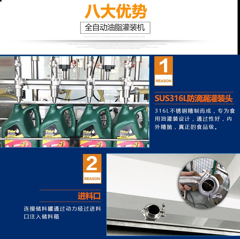 1.防滴漏灌裝頭由SUS316L不銹鋼精制而成,專為食用油灌裝設(shè)計,通過性好,內(nèi)外精拋,真正的食品級.