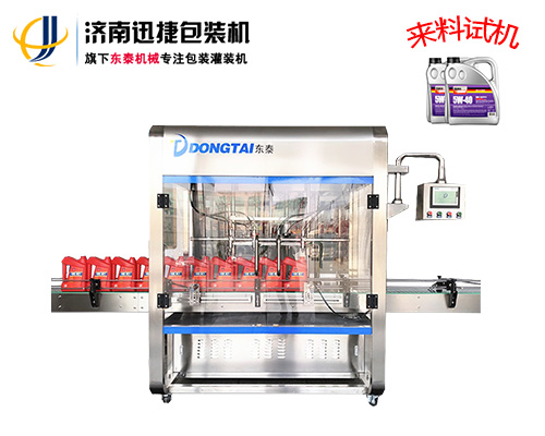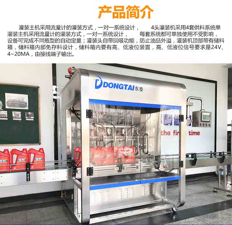 全自動潤滑油灌裝主機采用流量計的灌裝方式,一對一系統(tǒng)設(shè)計,4頭灌裝機采用4套供料系統(tǒng)單灌裝主機采用流量計的灌裝方式
