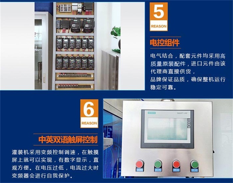 7.其他廠家采用調(diào)速電機,靠手動旋轉(zhuǎn)電機上的轉(zhuǎn)輪來改變輸送帶的速度,調(diào)整只能憑感覺極為不方便。我們的灌裝機采用變頻控制調(diào)速,在觸摸屏上就可以實現(xiàn),有數(shù)字顯示,直觀方便。在電壓過低,電流過大時變頻器會進行自我保護。