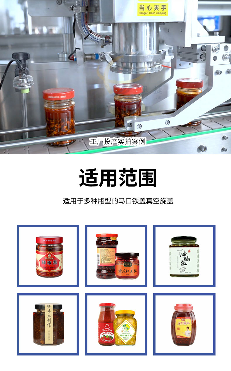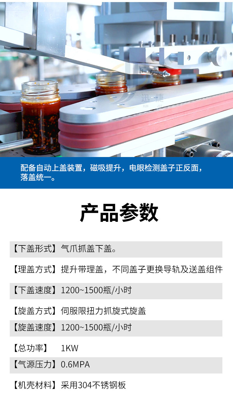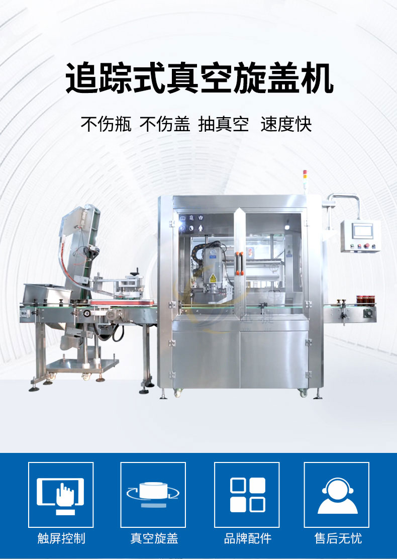 跟蹤式真空旋蓋機適用于多種瓶型的馬口鐵蓋真空旋蓋。設備由PLC結(jié)合觸摸屏控制,采用世界知名品牌電器和氣動元件,故障率低。