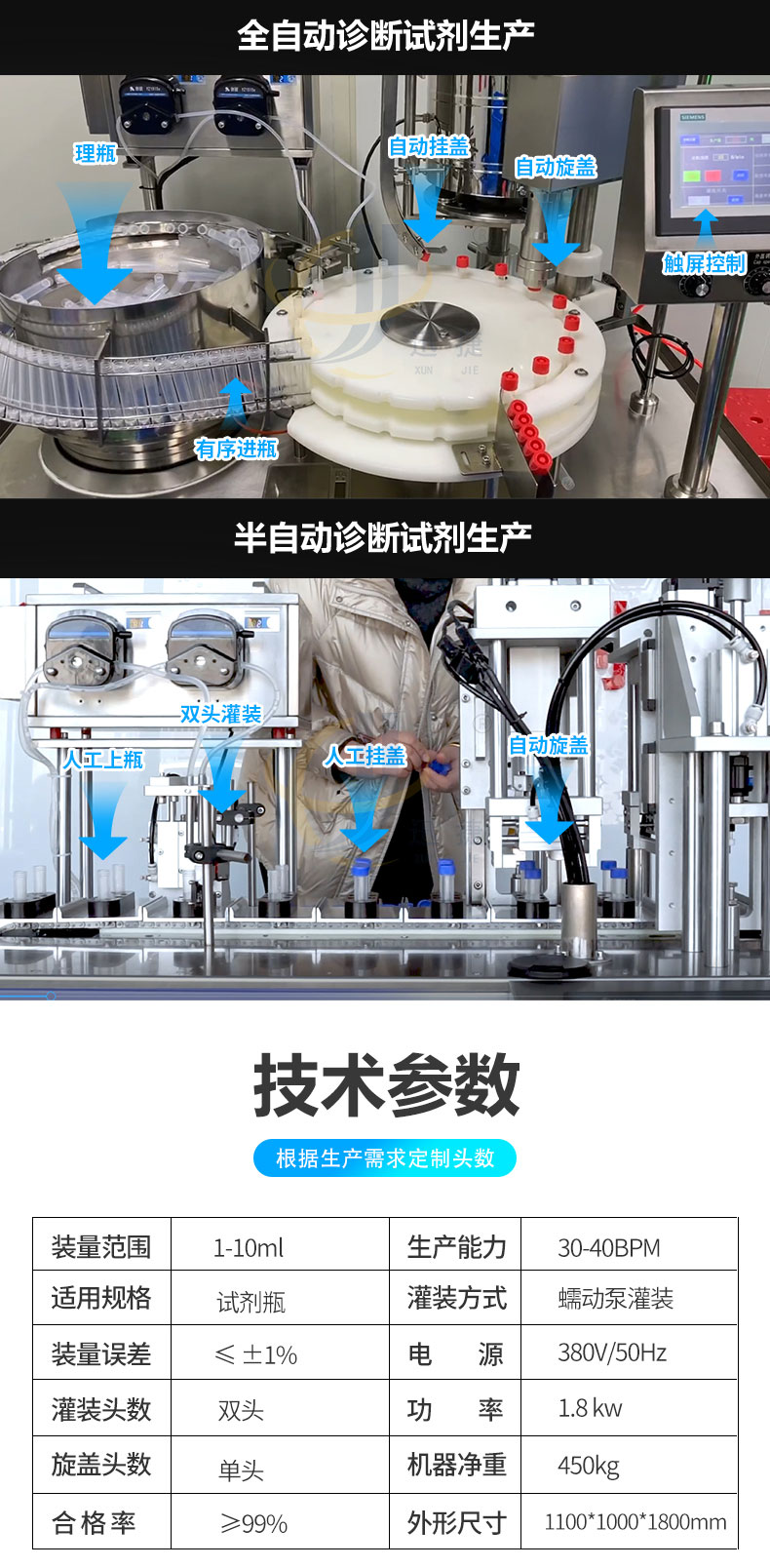 診斷試劑灌裝旋蓋機(jī)適用于診斷試劑、液體采樣管等管狀容器。本機(jī)可選配防塵罩搭配層流罩(FFU)結(jié)構(gòu),可達(dá)到局部百級(jí)環(huán)境下完成灌裝及封蓋。