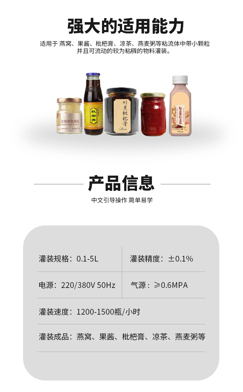 六頭柱塞灌裝生產(chǎn)線適用于燕窩、果醬、枇杷膏、涼茶、燕麥粥等粘流體中帶小顆粒并且可流動(dòng)的較為粘稠的物料灌裝。