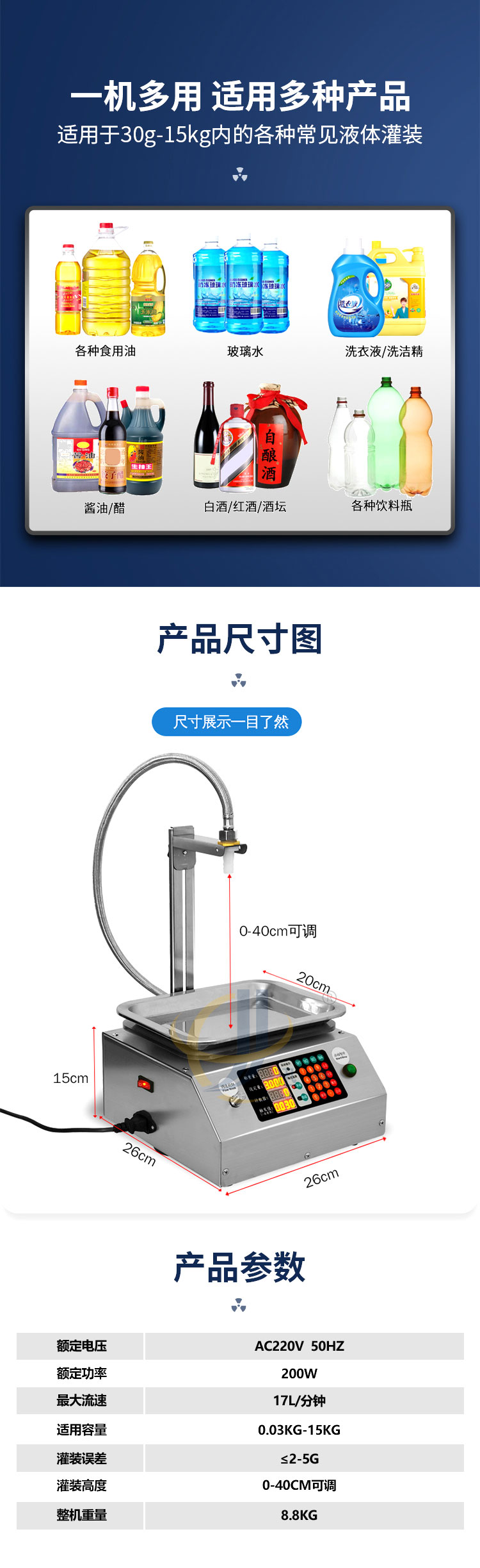 稱重式液體灌裝機適用于30g-15kg內(nèi)的各種常見液體灌裝。采用精度高,反應(yīng)靈敏的電子秤作為計量標(biāo)準(zhǔn)。其性能可以超越所有時間定量的方式。