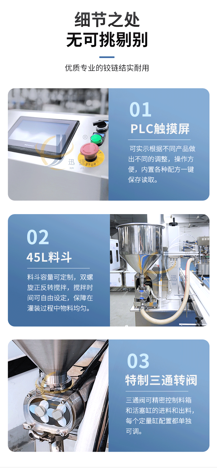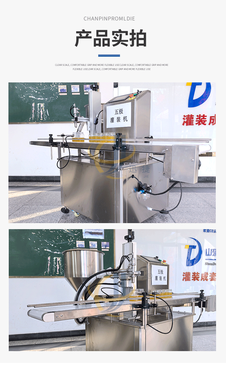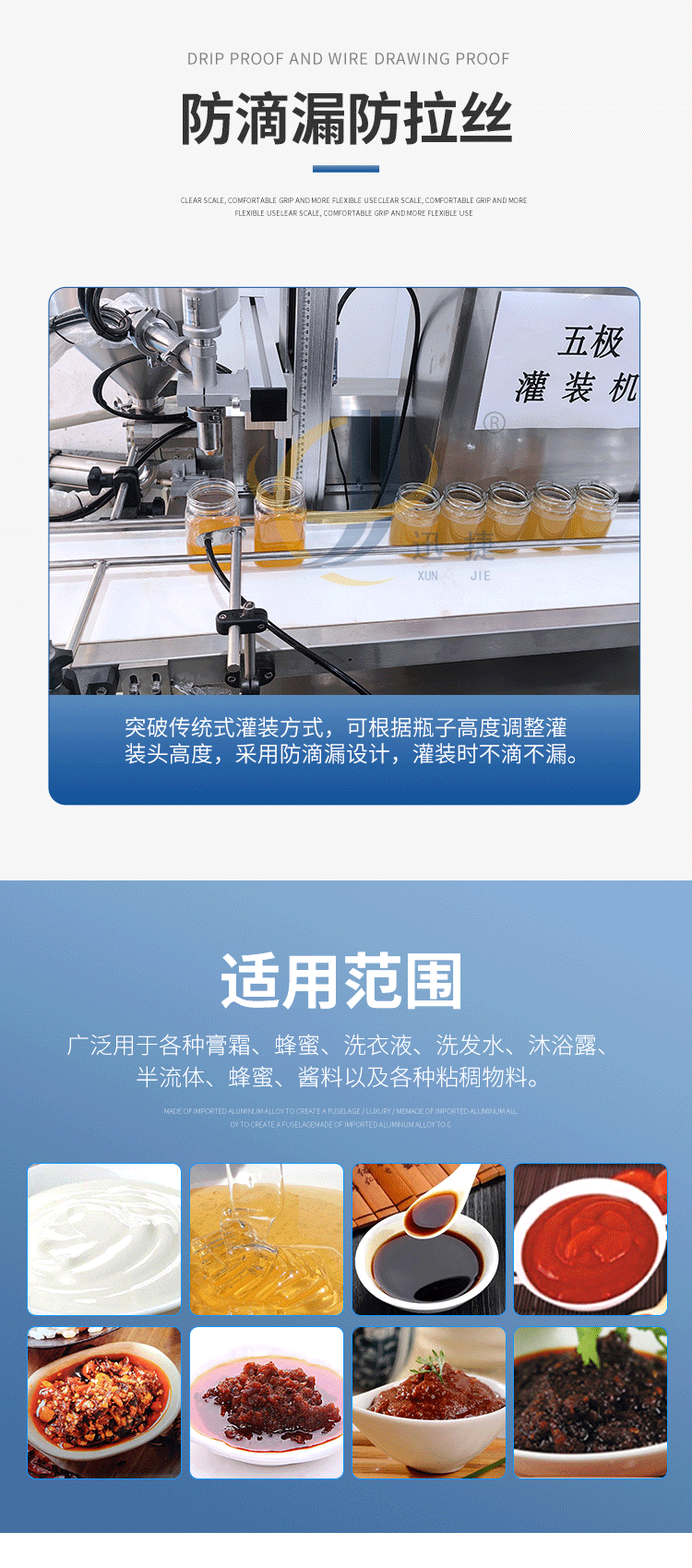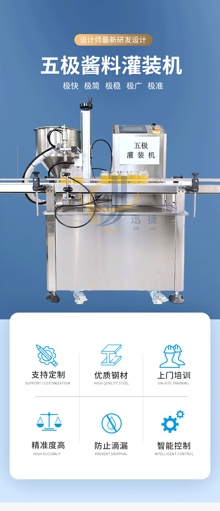 五極灌裝機(jī):極快-單頭2200瓶/時(shí) 極簡-操作簡單 極廣-啥啥都能灌 極穩(wěn)-24小時(shí)不停機(jī)  極準(zhǔn)-200g誤差小于1g。它可以和真空旋蓋機(jī)搭配使用。