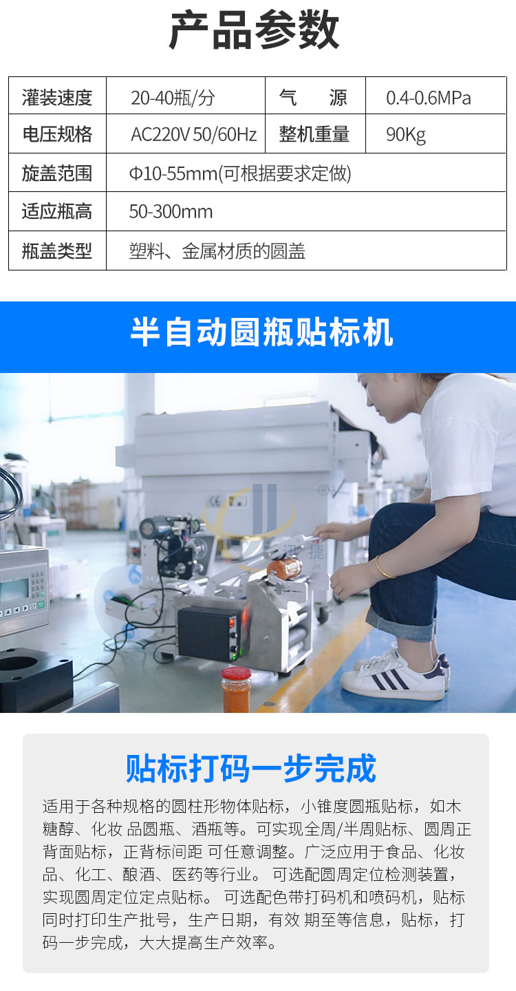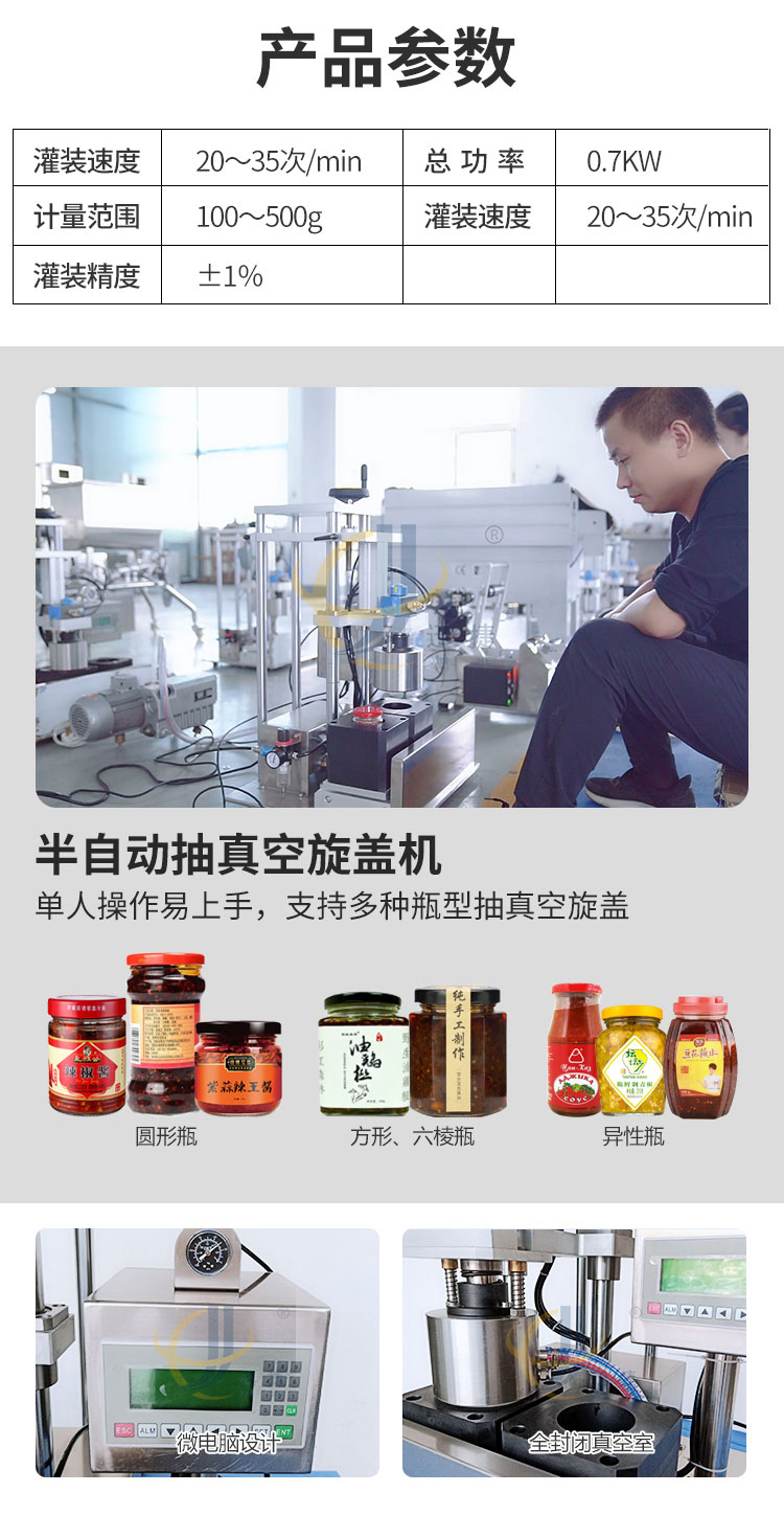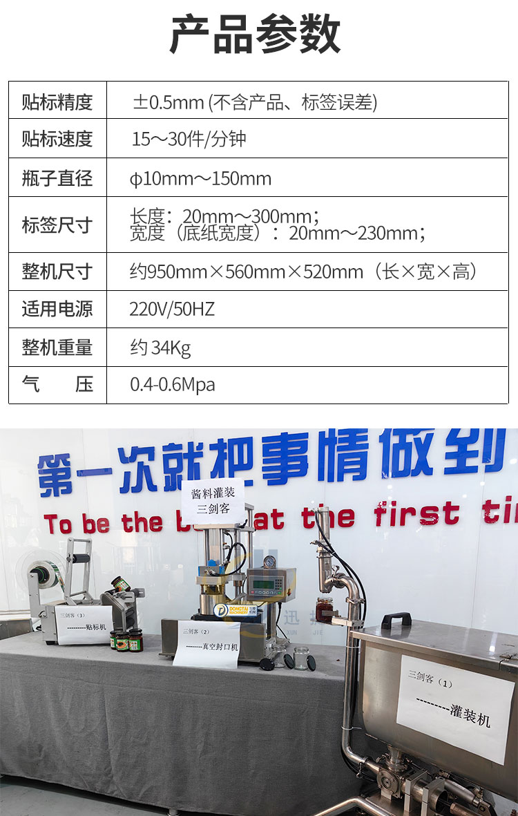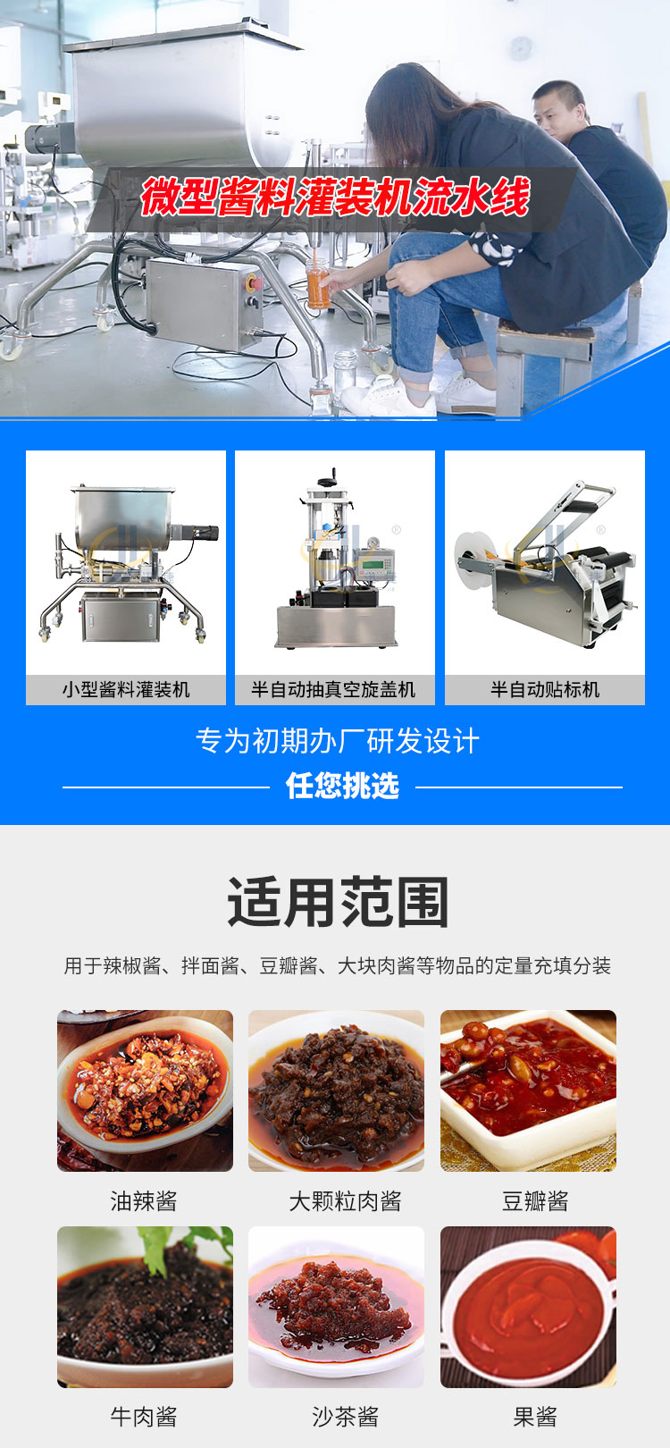 小型醬料灌裝生產(chǎn)線又名醬料灌裝三劍客,由半自動醬料灌裝機(jī)+半自動真空旋蓋機(jī)+半自動圓瓶貼標(biāo)機(jī)組合而成。