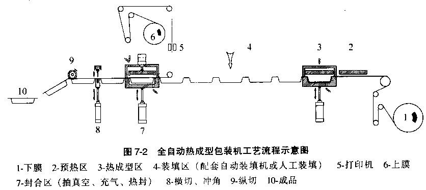 包裝的全過稅由機器自動完成,根據(jù)需要,裝填可采用人工或機械實現(xiàn)。內(nèi)流程圖可見,下卷膜經(jīng)牽引以定步距步進,經(jīng)預(yù)熱區(qū)及加熱區(qū),由氣壓、真空或沖模成型,在裝填區(qū)填充物料后進入熱封區(qū)。在熱封區(qū)中,上卷膜經(jīng)導(dǎo)輥后覆蓋在成型盒上,視包裝需要可進行抽真空或充入保護氣體的處理,然后進行熱壓封合。后經(jīng)橫切、縱切及切角修邊形成一個個美觀的包裝成品。至于經(jīng)裁切后的邊料可由抽吸捅或卷揚裝置收集和清理。